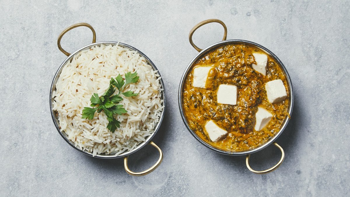 Hjemmelavet hytteost og spinat i en sovs af tomat, ingefær, hvidløg, løg, fløde og urter.