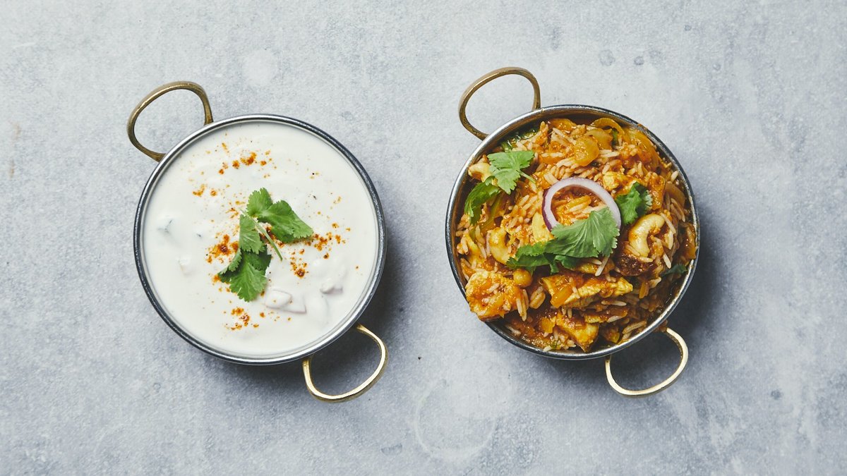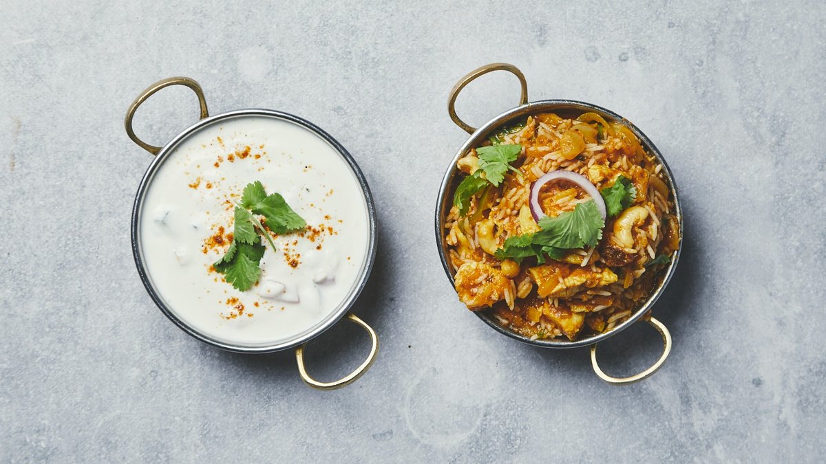 Kylling, ris med løg, kartoffel, tomat, ingefær, urter, kikærter, cashewnødder og raita af yoghurt med urter, tomat, friske koriander, agurk og kikærter.