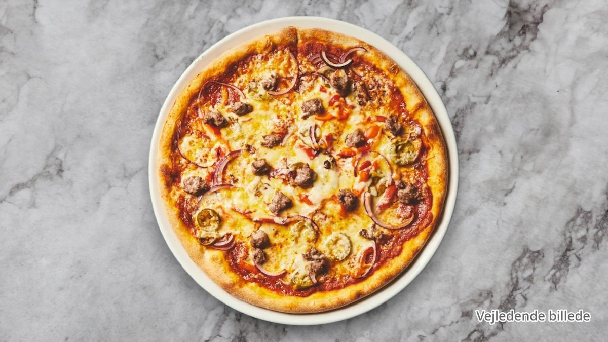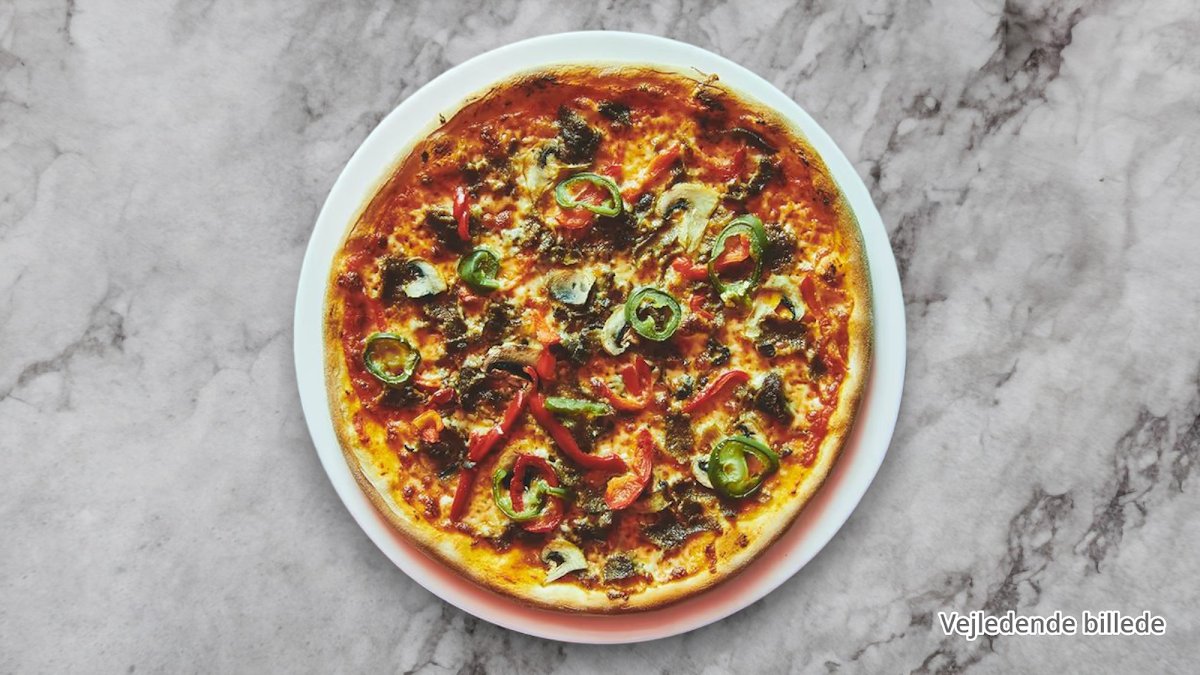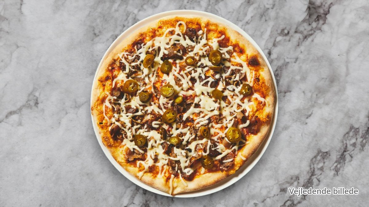 Tacosauce, ost, oregano, kødsauce, kebab, tomatskiver, jalapenos og hvidløg på pizza.