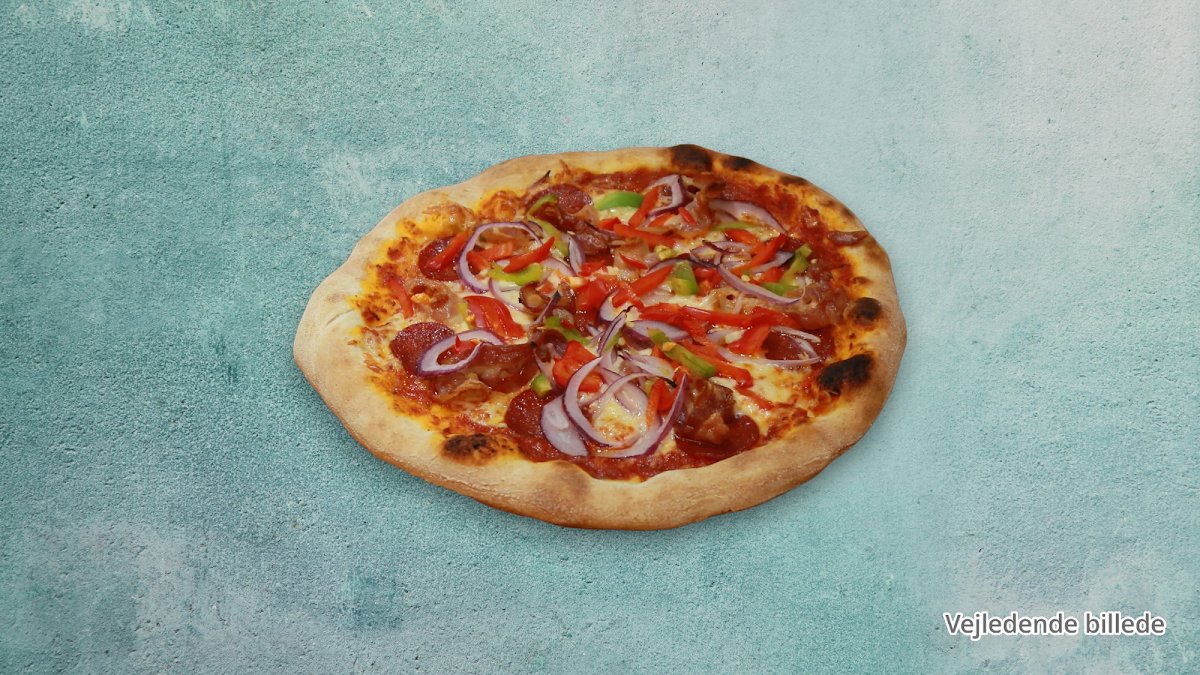 Pizzasauce, ost, oregano, skinke, pepperoni, pølser og peberfrugt.