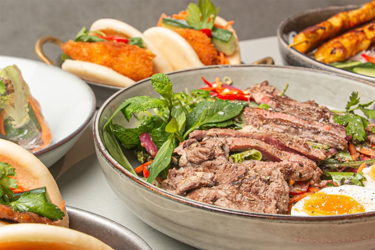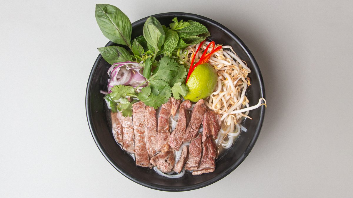 Signatur pho med lynstegt ribeye. Serveres med sød basilikum, koriander, bønnespirer, rødløg, frisk chili og lime.