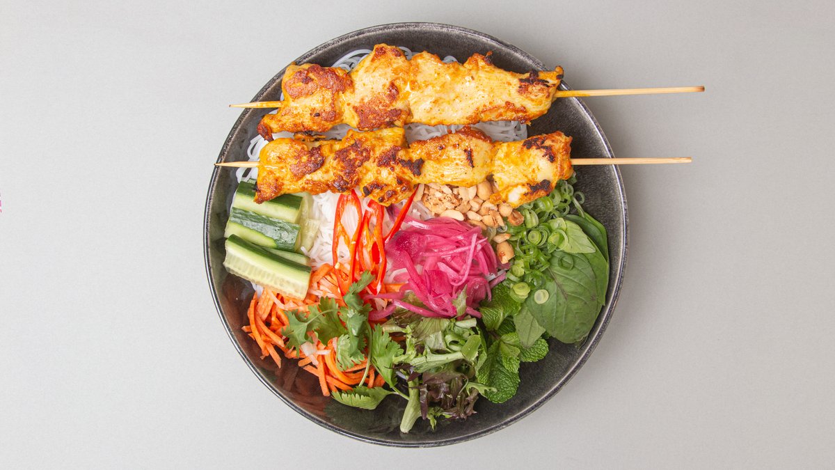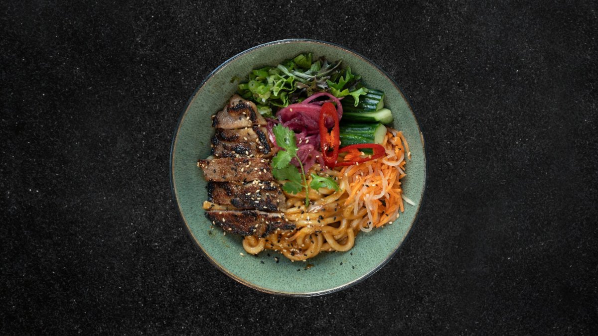 Udonnudler i hjemmelavet sauce (teriyaki, tahin, soja og chili) serveres med, agurk, fåreknold, blandet salat, frisk chili, koriander, syltede rødløg og gulerødder.