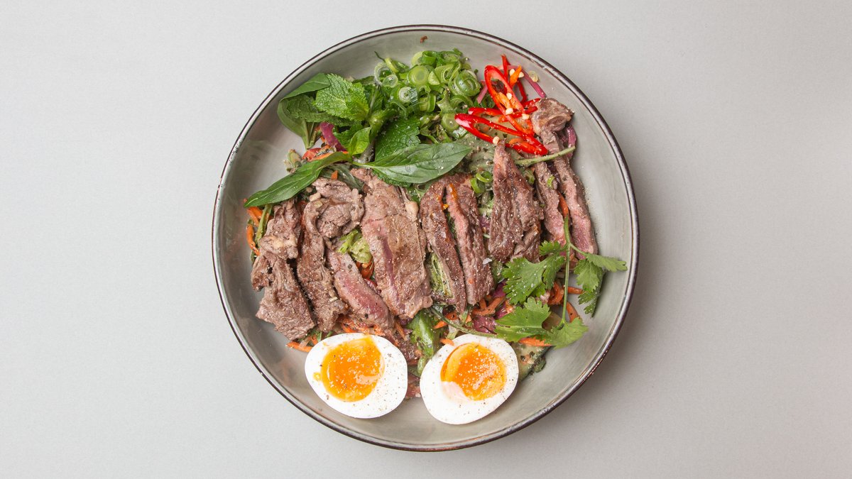 Lynstegt ribeye med grøntsager, urter og blødkogt æg og asiatisk chimichurri.