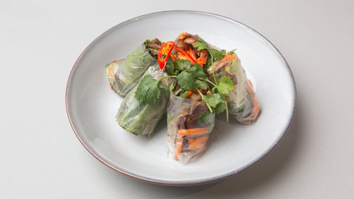 Syltede gulerødder og kinaradiser, agurk, chili og koriander, soya og hjemmelavet char siu mayo.