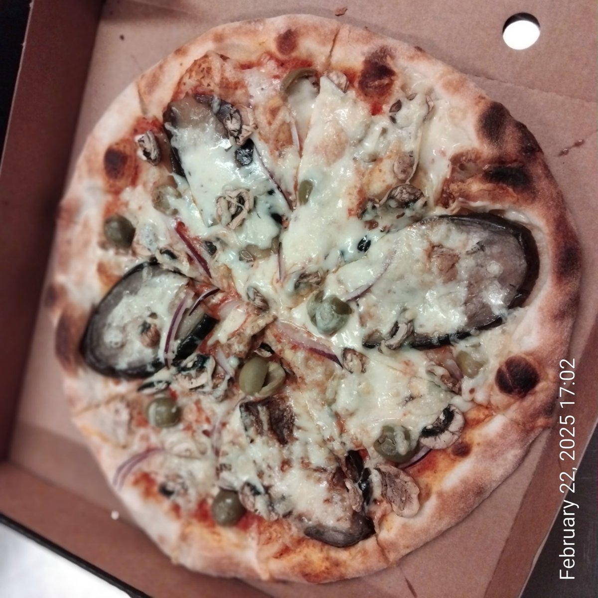Pizzasauce, Ost, Auberjine, Oliven, Løg, Champignon.