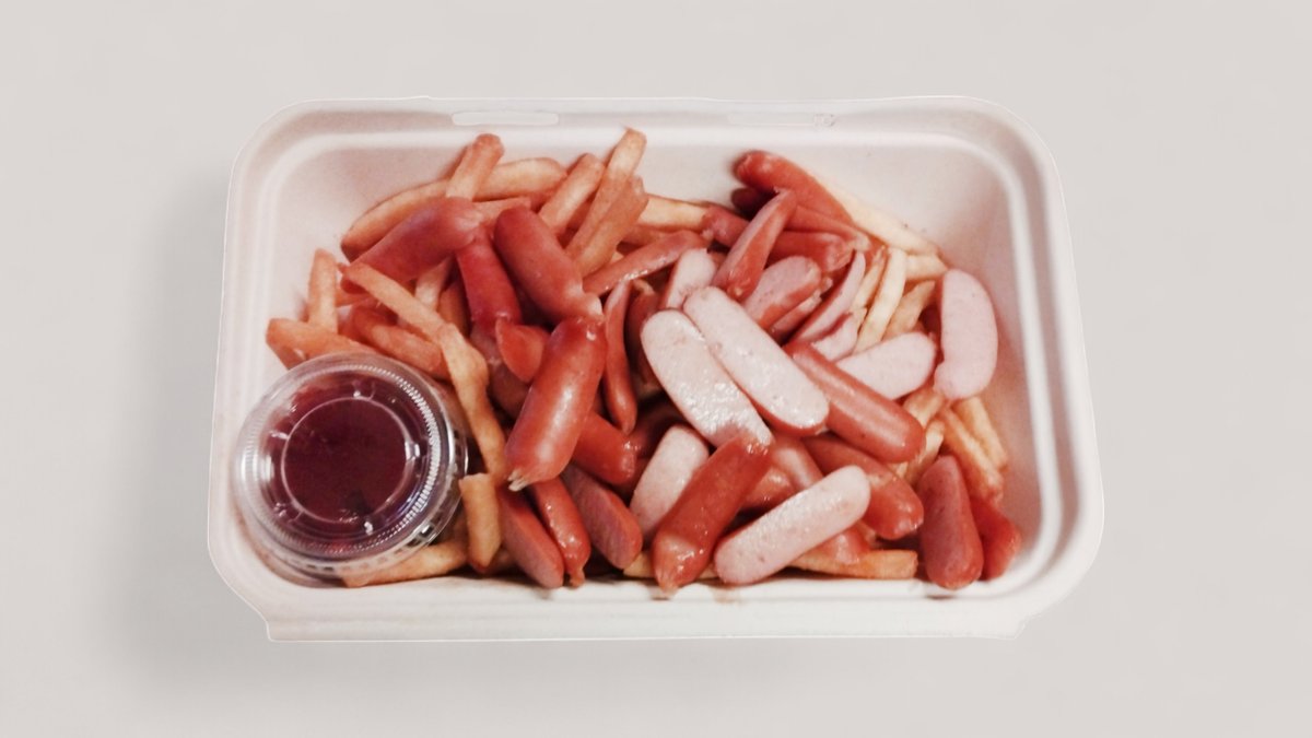 Serveres med pommes frites og én valgfri dåsesodavand.