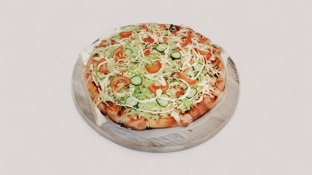 Tomatsauce, Ost, Kebab, Løg, Salat, Agurk, Tomat, Dressing