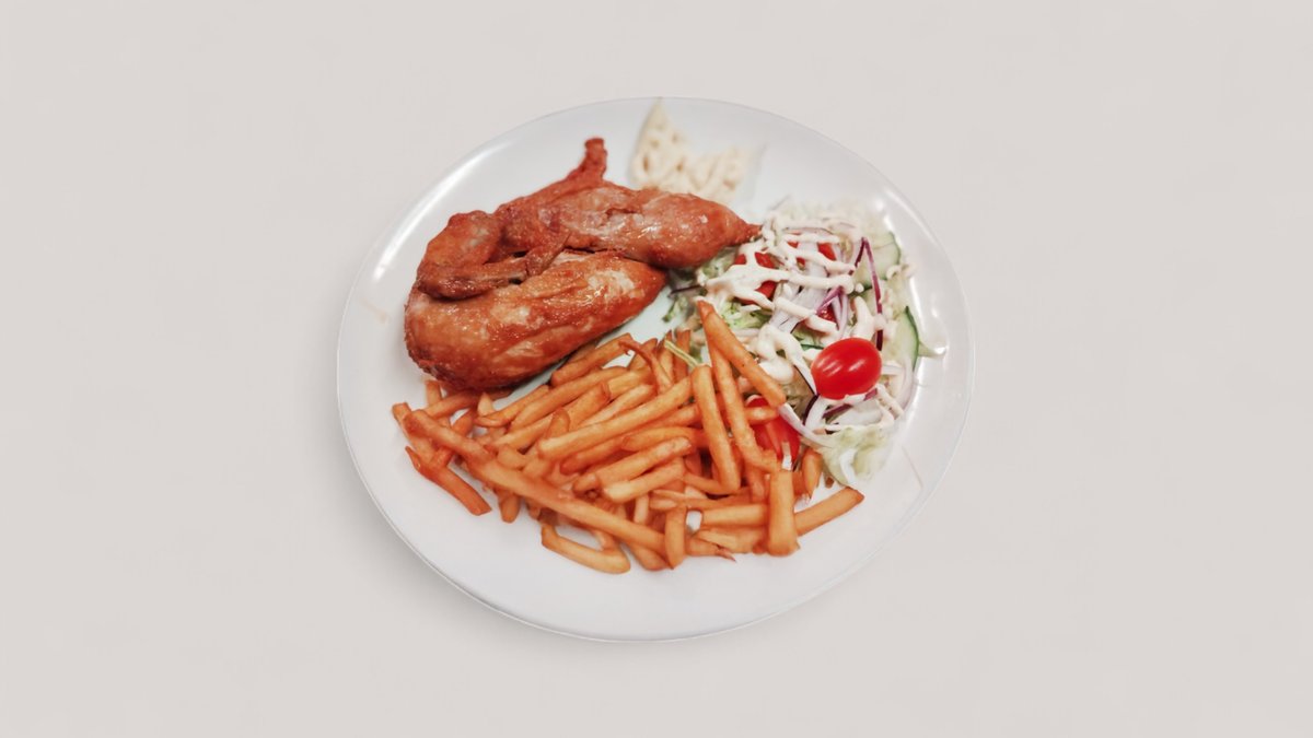kylling,pommes fries,salad,dressing,agurk,omaskiver,løg