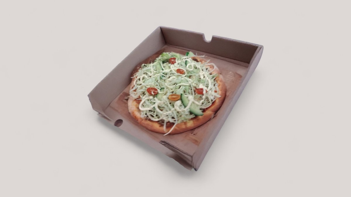 Tomatsauce, ost, kebab, løg og bearnaisesauce.