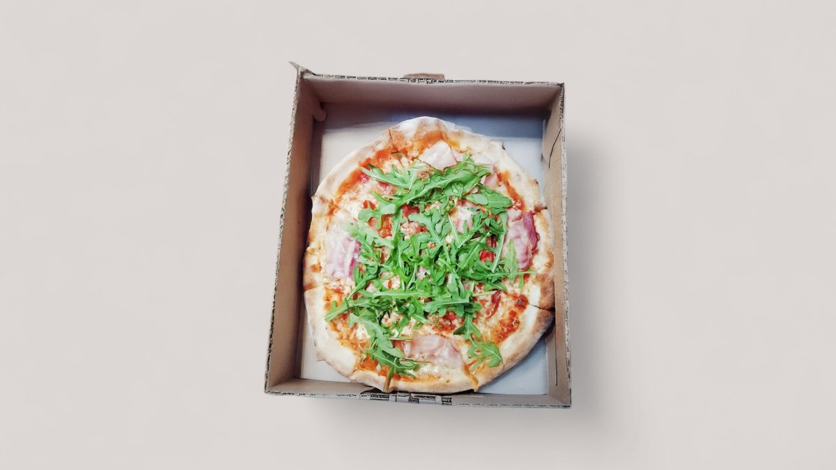 Pizzasauce, Ost, Parmaskinke, Bacon, Rucola