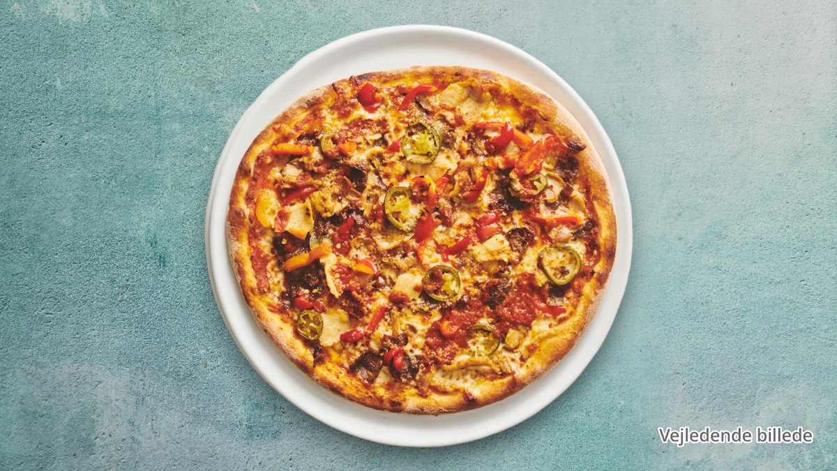 Pizzasauce, Ost, Kebab, Kylling, Peberfrugt, Jalapenos, husets chilisauce