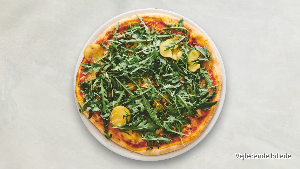 Pizzasauce, Ost, Oksefilet, Tomatskiver, Rucola.