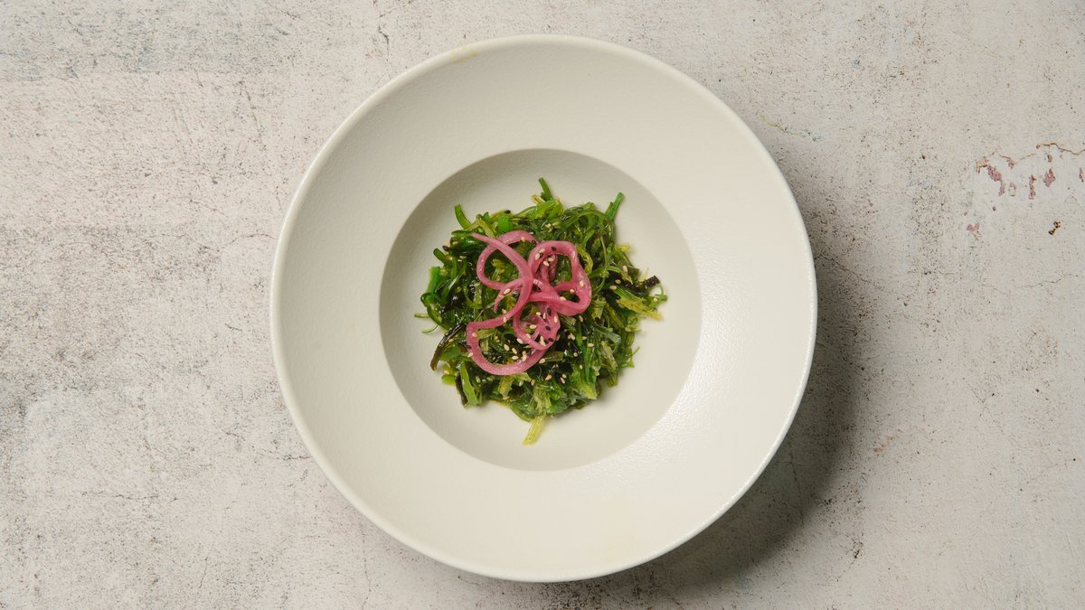 Okse bulgogi med nudler, salat, gulerødder, agurk, rødkål, edamamebønner, tangsalat, syltede rødløg, syltede kinaradise og stegte udon nudler. Bowlen toppes med chilimayo, unagisauce, sesam og tang.