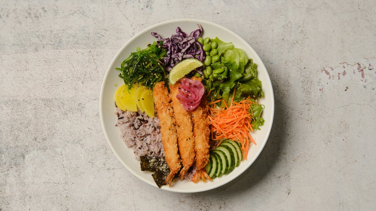 Crispy ebi rejer med ris, salat, gulerødder, agurk, rødkål, edamamebønner, tangsalat, syltede rødløg, syltede kinaradise og en blanding af sorte og hvide ris. Bowlen toppes med chilimayo, unagisauce, sesam og tang.