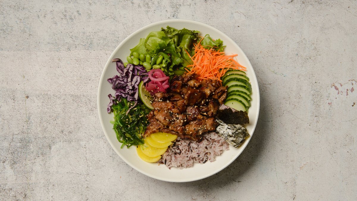 Okse bulgogi med ris, salat, gulerødder, agurk, rødkål, edamamebønner, tangsalat, syltede rødløg, syltede kinaradise og en blanding af sorte og hvide ris. Bowlen toppes med chilimayo, unagisauce, sesam og tang.