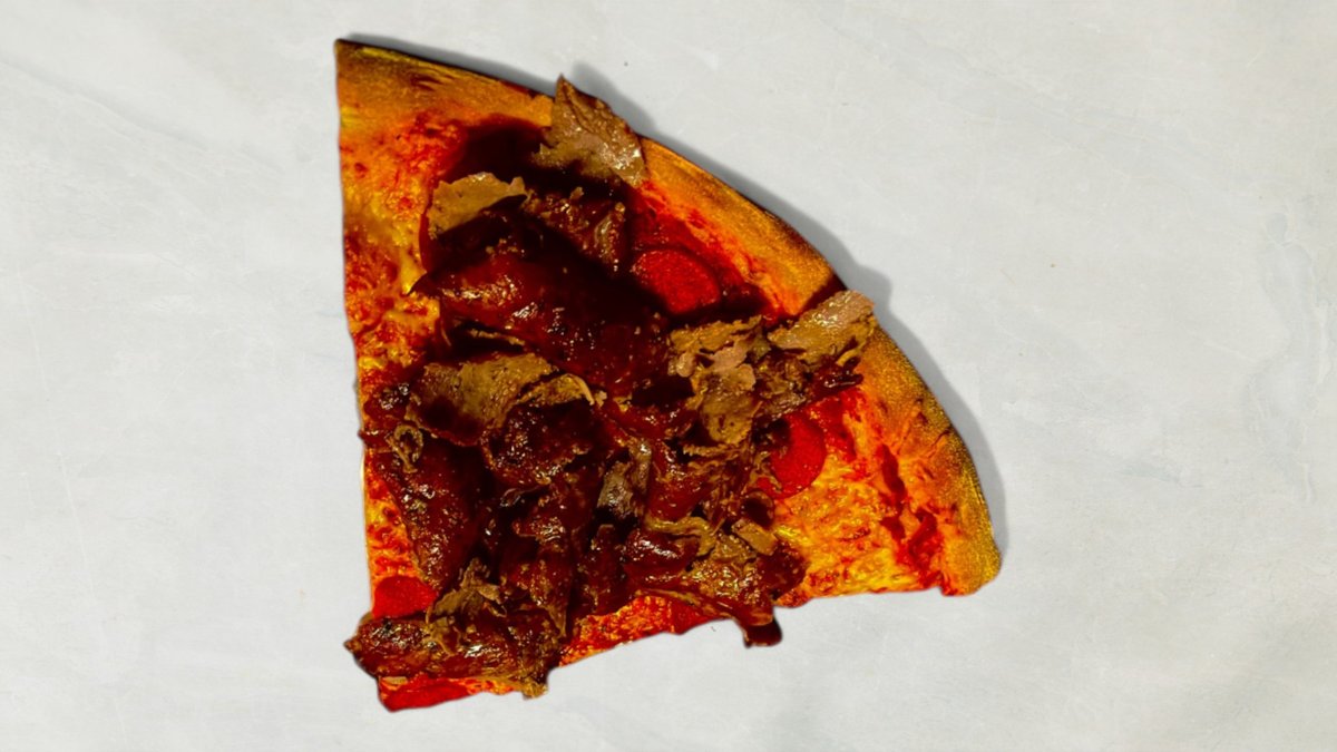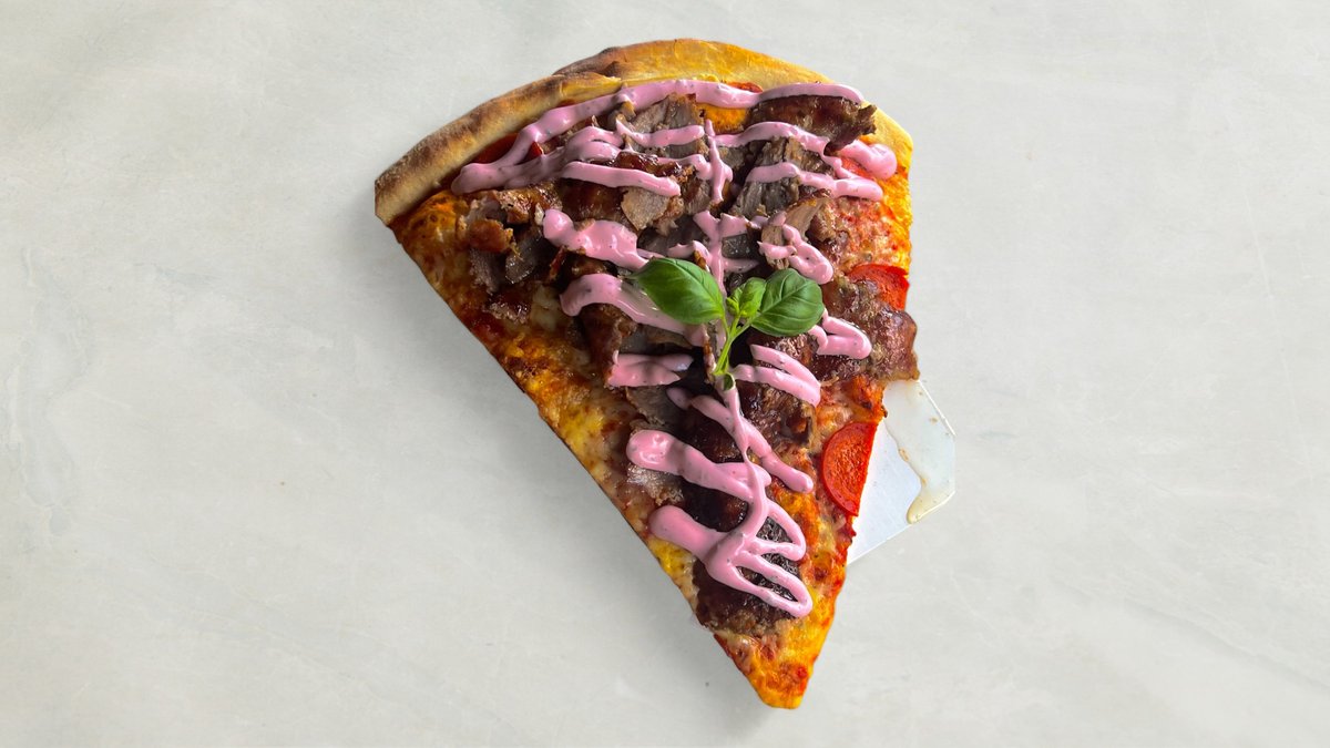 Pizzaslice med tomatsauce, ost, kebab og pepperoni.