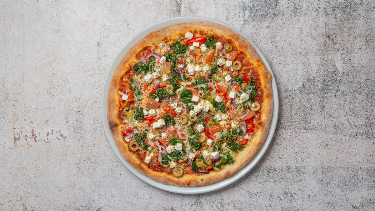 Tomatsauce, ost, spinat fetaost, løg rød peber, oliven og friske tomater