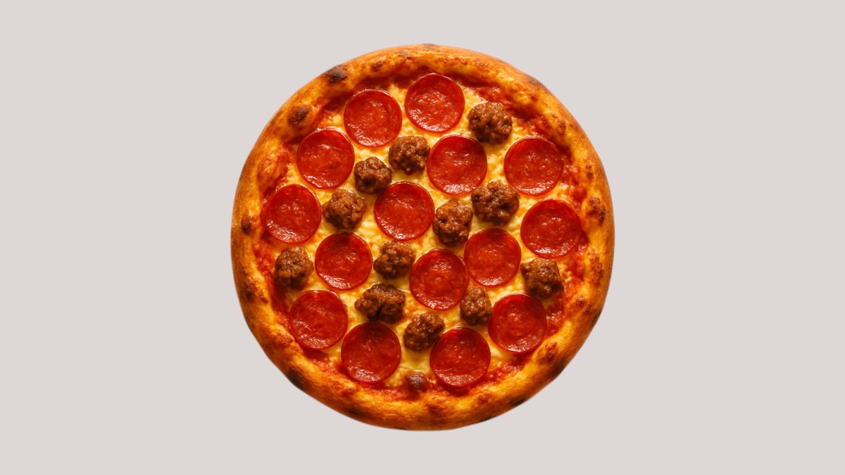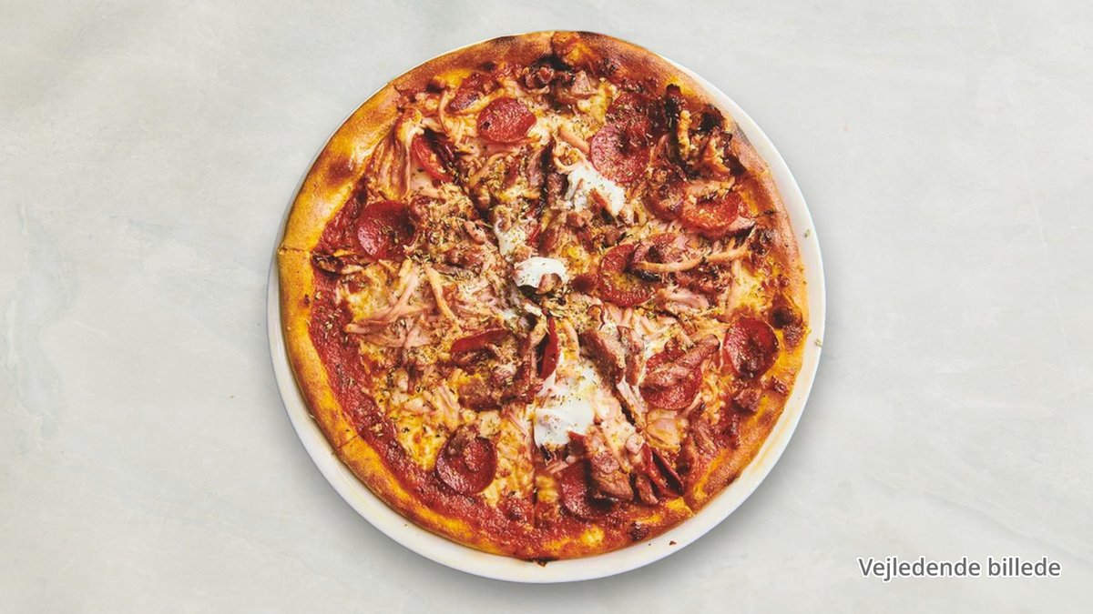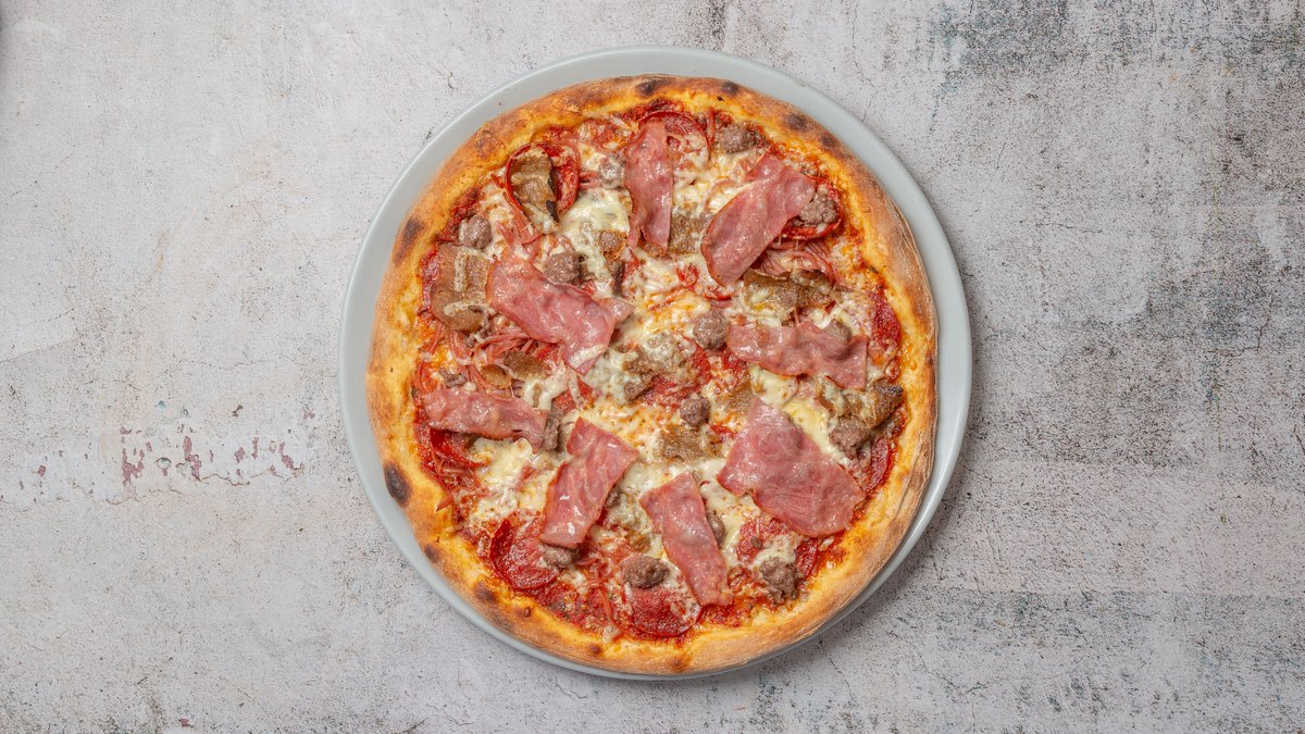 Tomatsauce, ost, oksekød, skinke bacon, pepperoni og pølser.