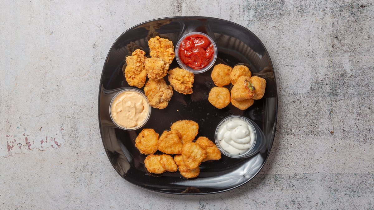 Serveres med pommes frites, en valgfri 0,33 l sodavand og en valgfri dyppelse.