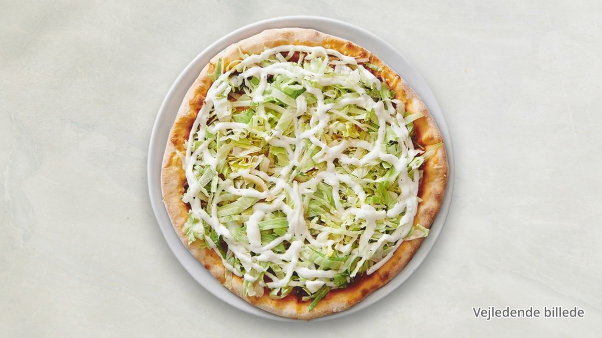 Tomatsauce, ost, kebab, løg, salat og dressing.