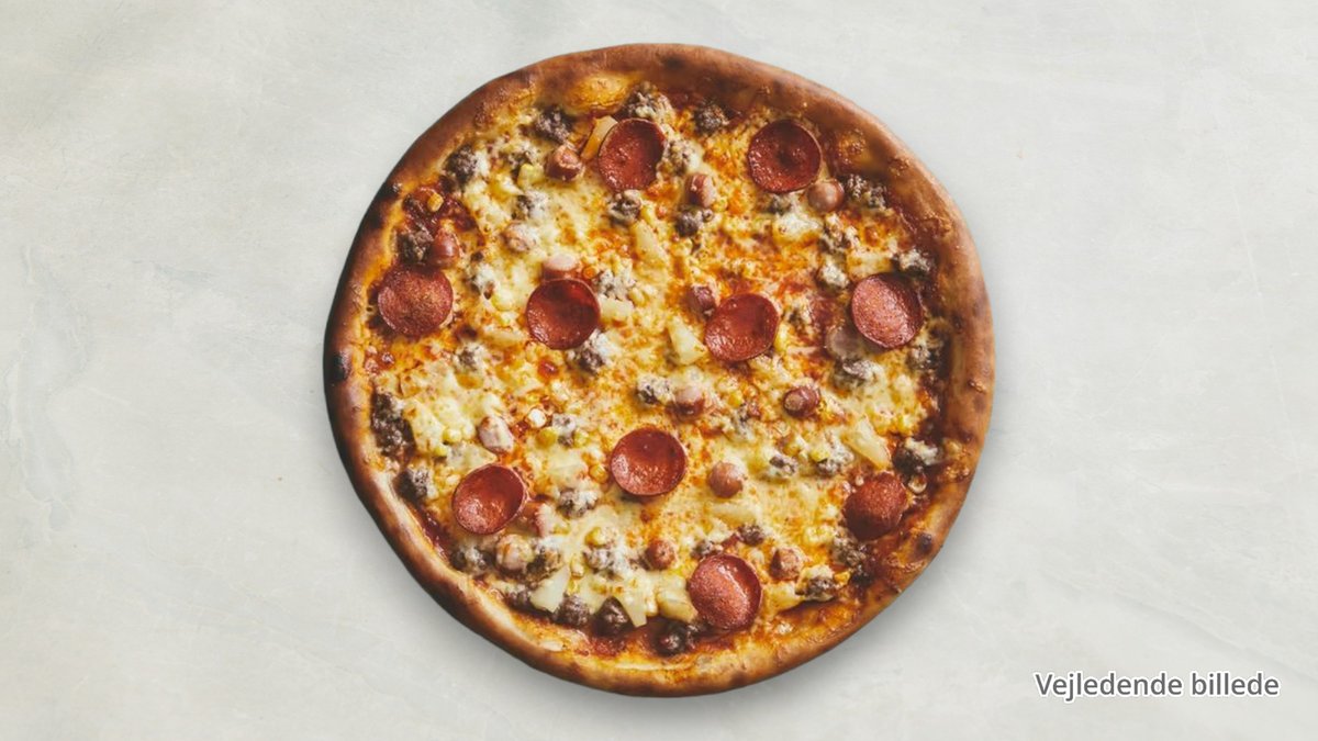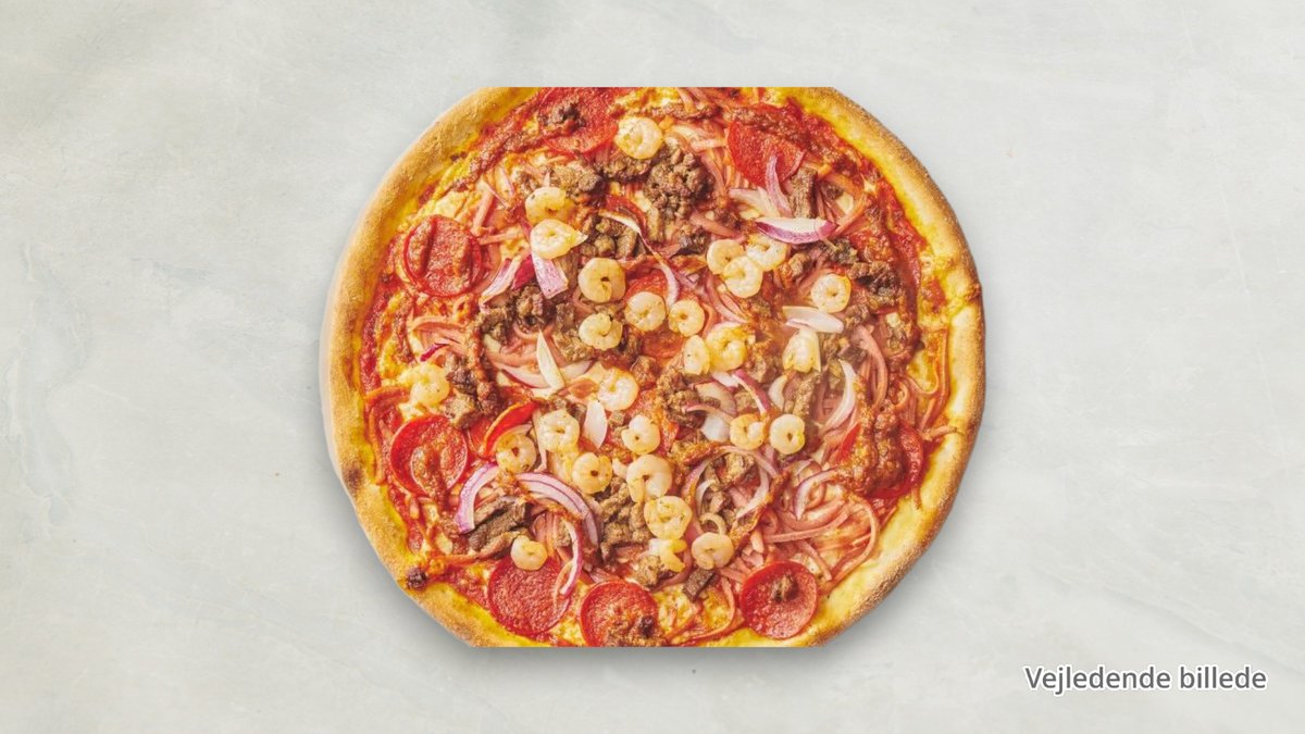 Tomatsauce, ost, skinke, champignon, rejer og pølser.