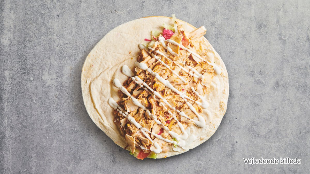 Lunt fladbrød med kylling, salat, tomat, agurk løg og hjemmelavet dressing.