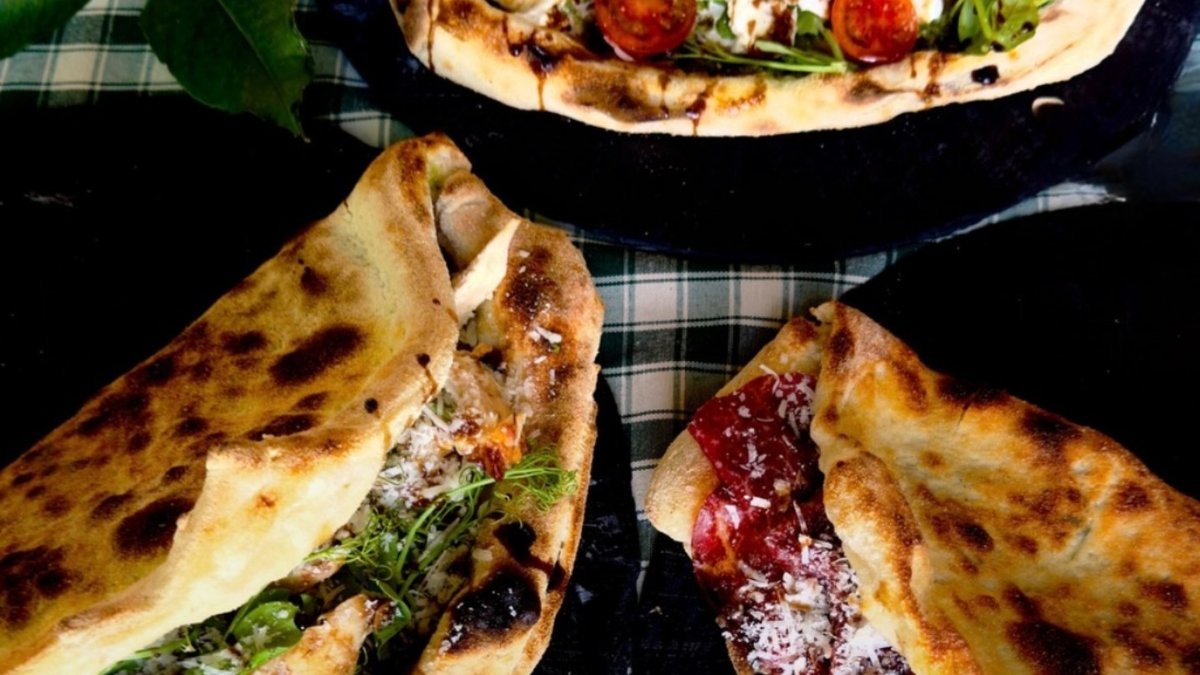 Surdejsbrød med Mozzarella, rucola, pesto og balsamico.