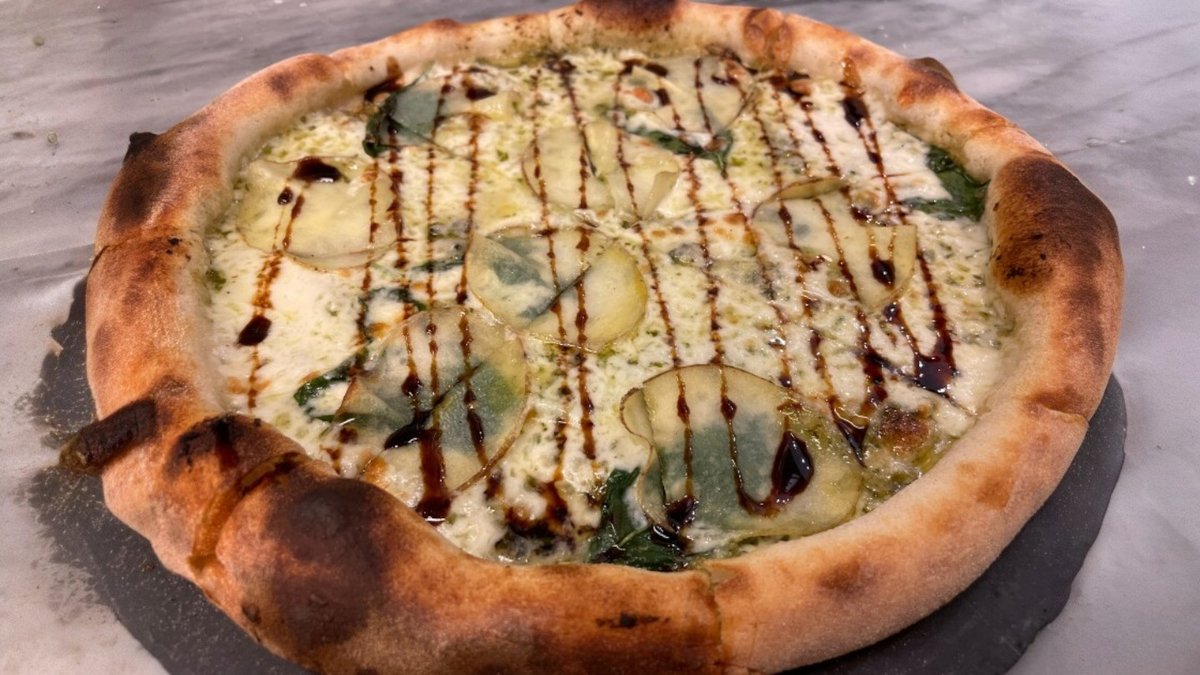 Pizzabund med kartoffel, pesto, mozzarella, parmigiano og Grana Padano.