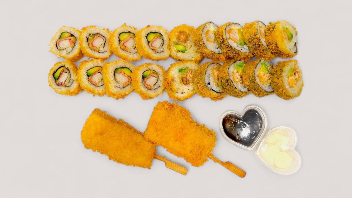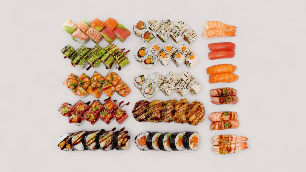 Uramaki 8 x California 8 x Laks 8 x Spicy Tun Kaburimaki 8 x Rollin’Rainbow 8 x Green Dragon 8 x Red Dragon 8 x Rollin’Pop Futomaki 5 x Rollin’Chicken 5 x Laks 5 x Dyna Ebi Nigiri 2 x Laks 2 x Flamme Laks 2 x Tun 2 x Flamme Tun 2 x Ebi Reje 2 x Flamme Ebi Reje