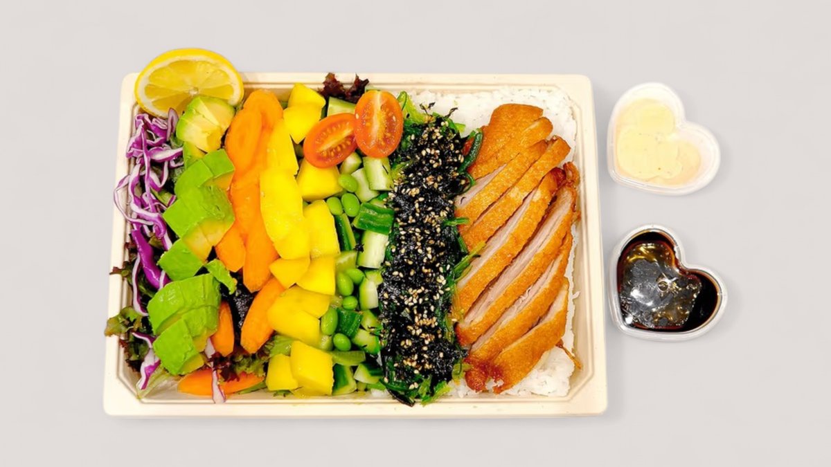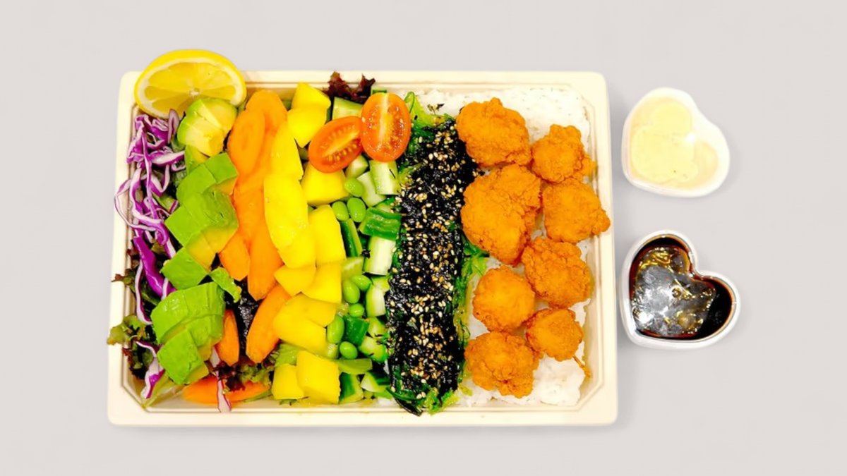 Ris i bunden toppet m. japanske kyllingenuggets, avocado, agurk, tangsalat, salat, gulerod, rød spidskål, mango, edamame-bønner, cherry tomat, knust nori, sesam, chilimayo og teriyaki