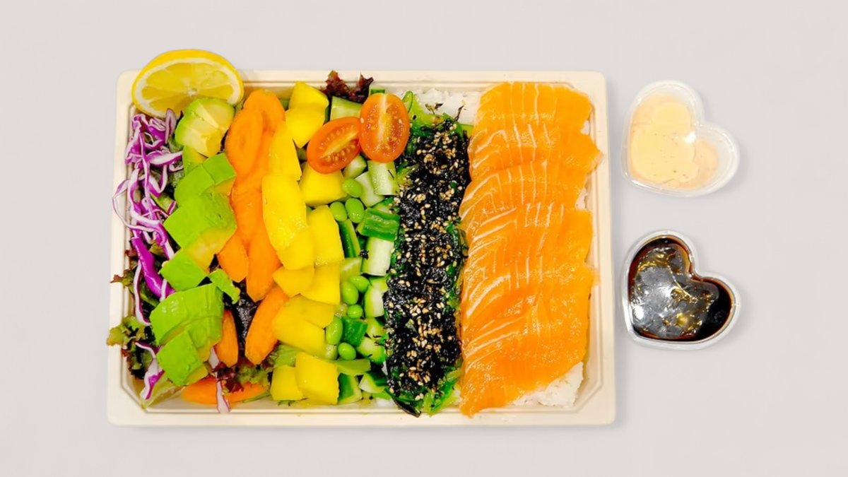 Ris toppet med laks, avocado, agurk, tangsalat, salat, rødkål, mango, edamammebønner, cherrytomat, sesam, chilimayo og teriyaki.
