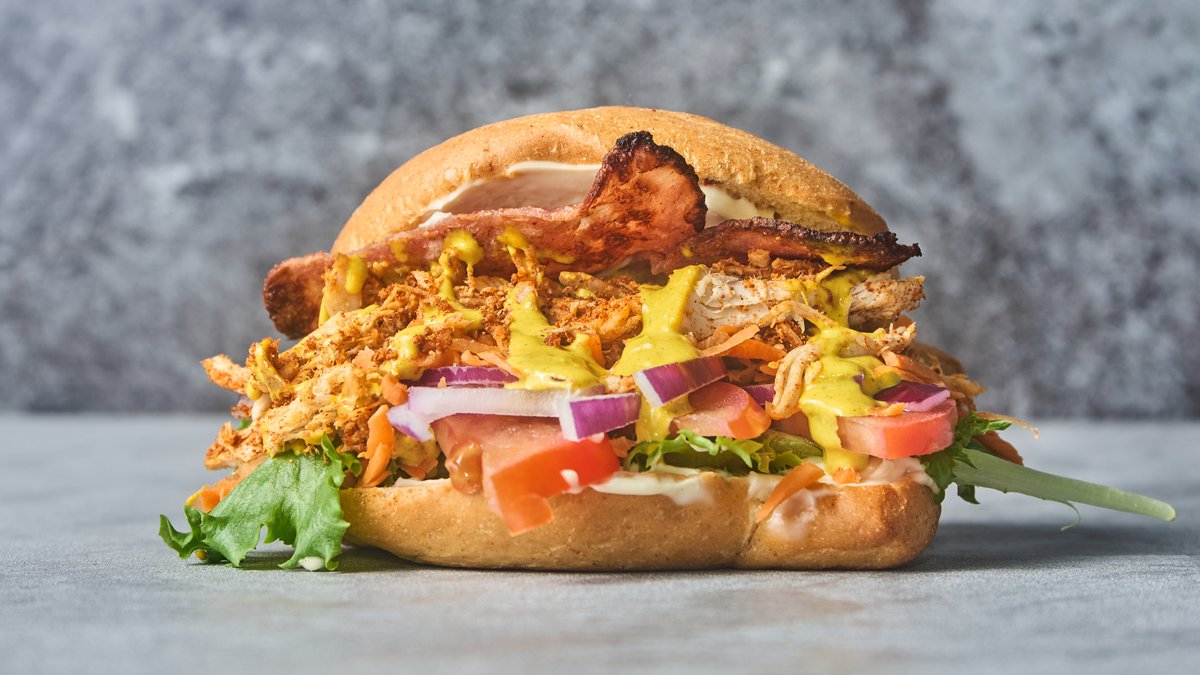 Sandwich med fyld af kylling, bacon, mayo, babymix, tomat, gulerødder, løg og karrydressing.