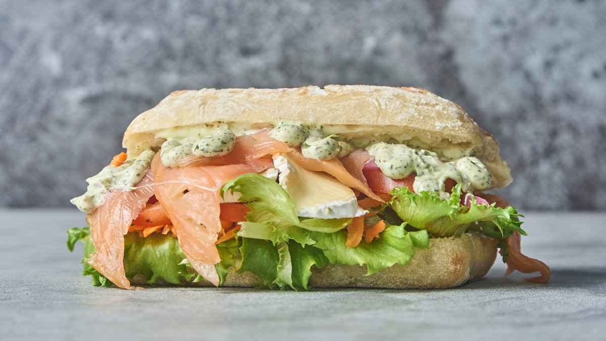 Sandwich med fyld af babyleaf, laks, hjemmelavet syltede rødløg, brieost, gulerødder, tomat og urtedressing.