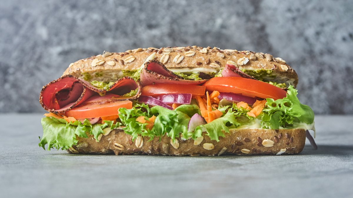Sandwich med fyld af mayo, pastrami, babymix, gulerødder, løg, tomat og pestodressing.
