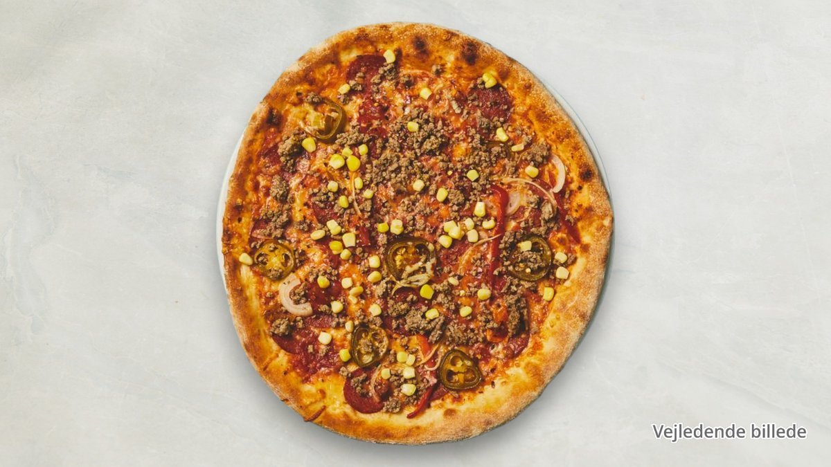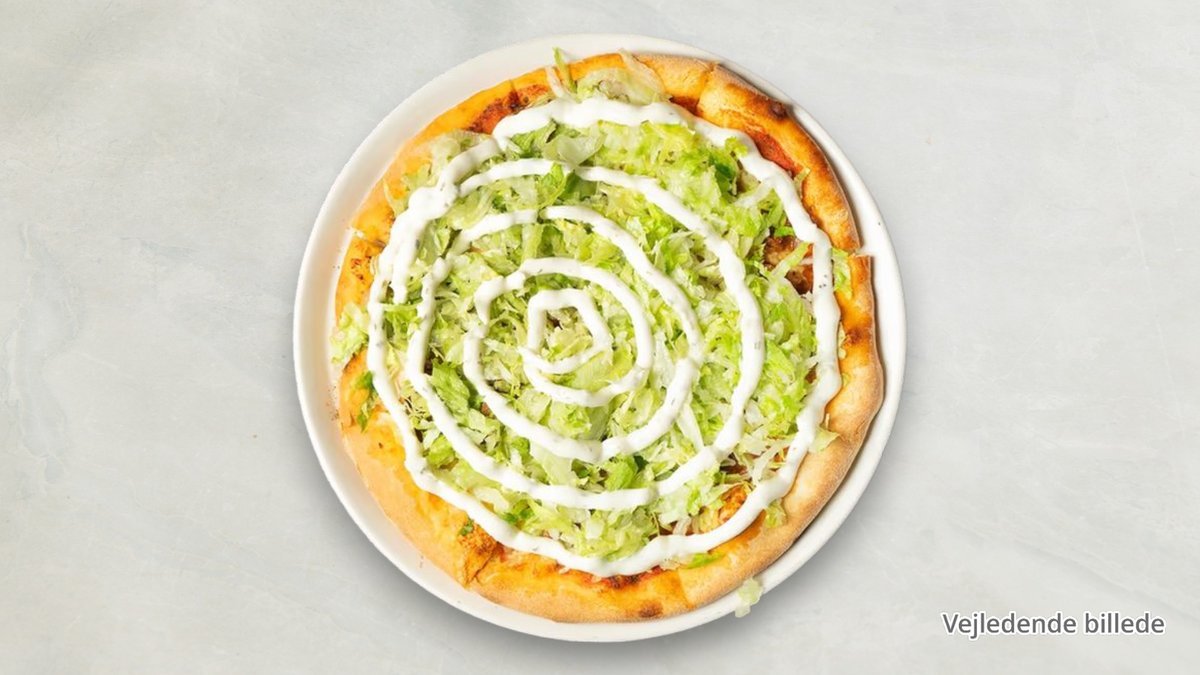 Tacosauce, kebab, kylling, jalapeños, peberfrugt, chilli og hvidløg på pizza.