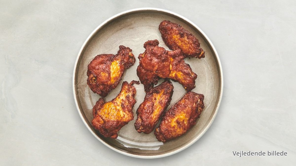 8 stk. Chicken Wings med pommes frites og BBQ sauce, ketchup, remoulade og pommes sauce.