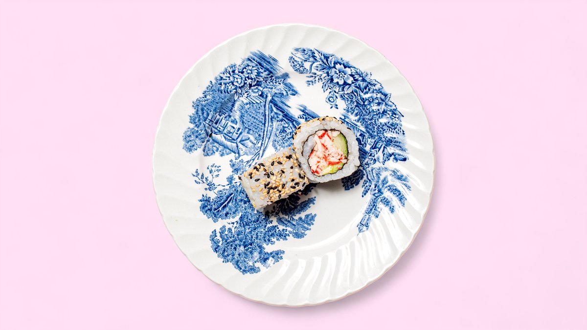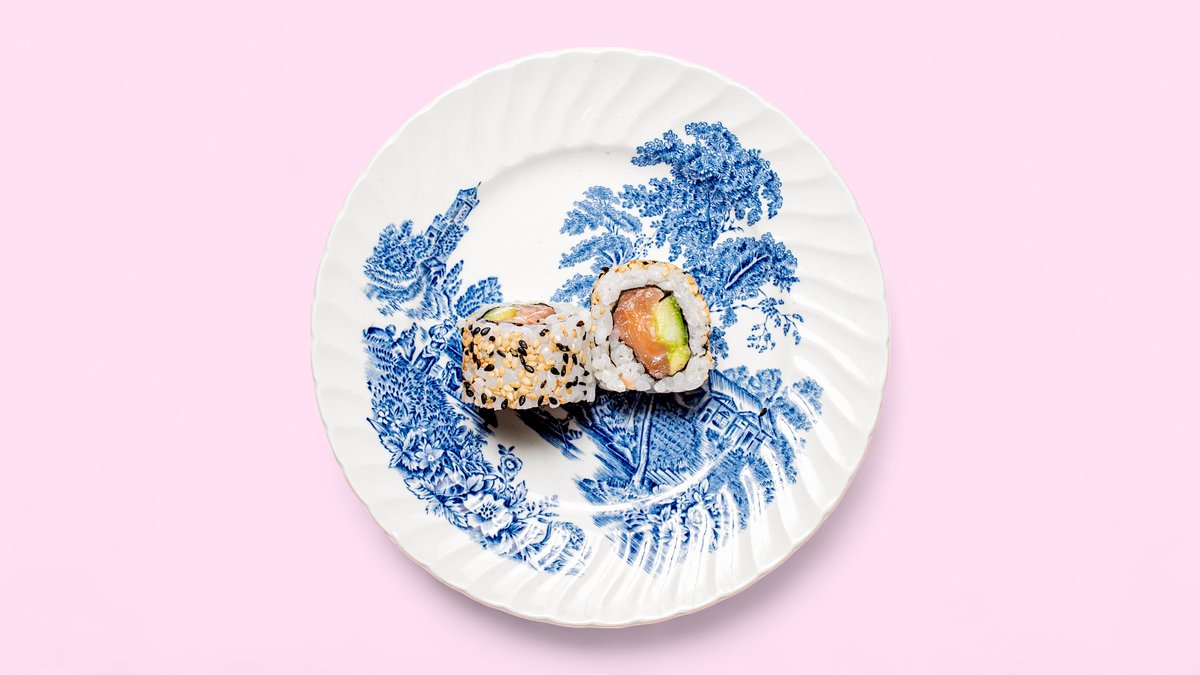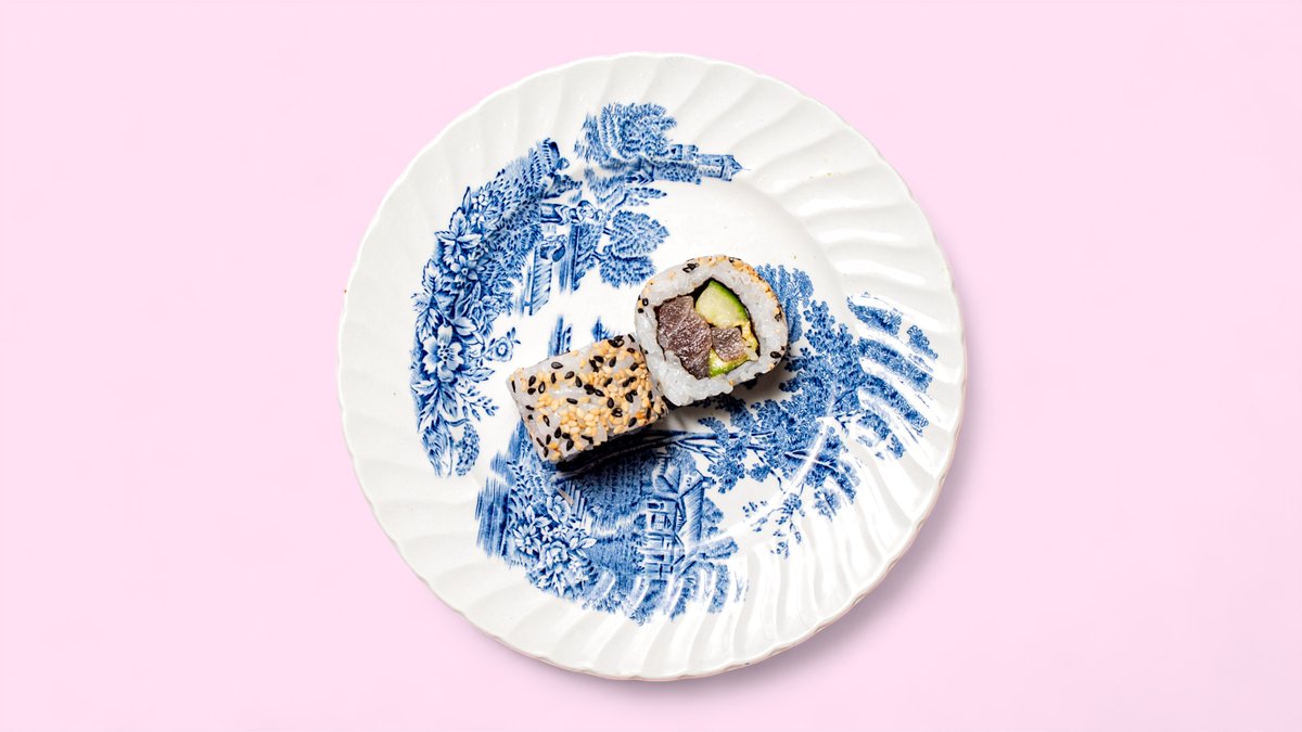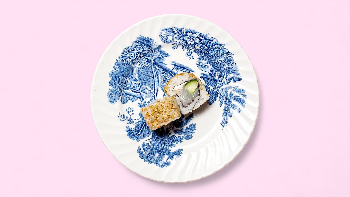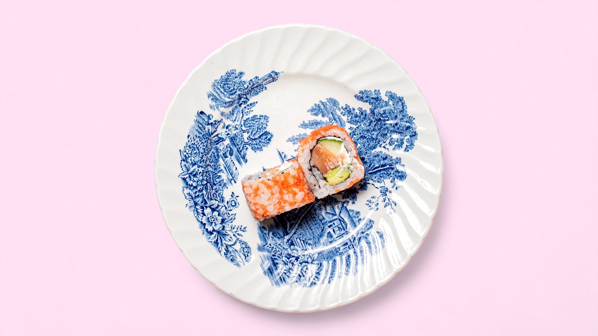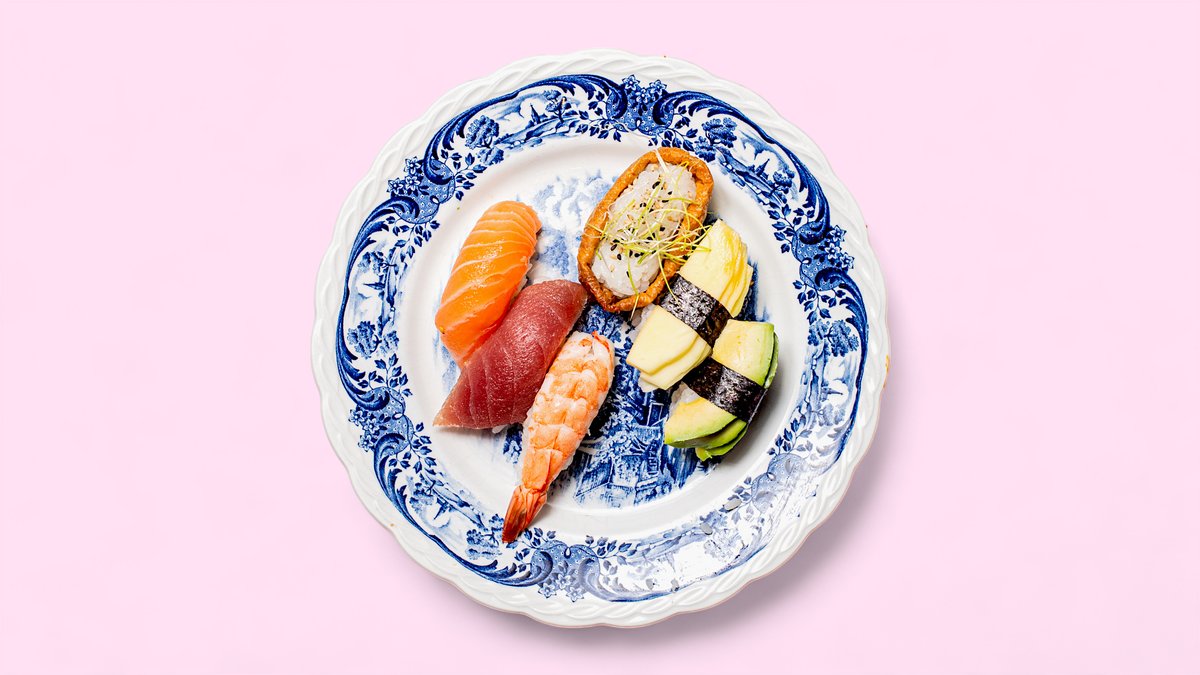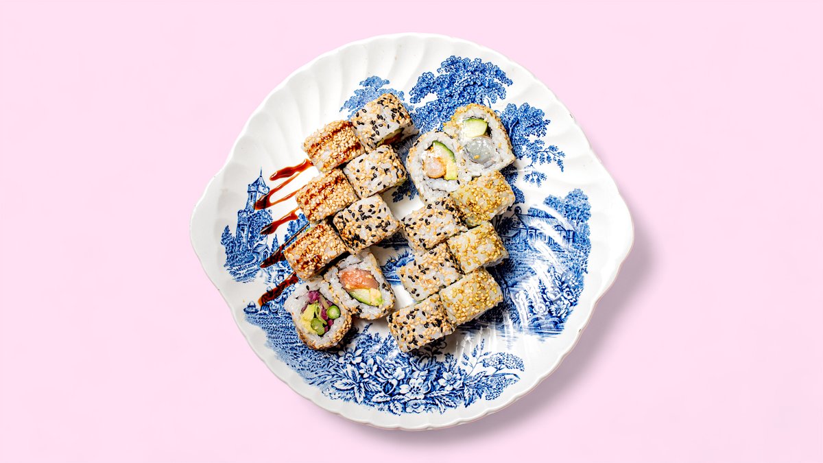 California, agurk og avocado toppet med laks, tun, reje og avocado.