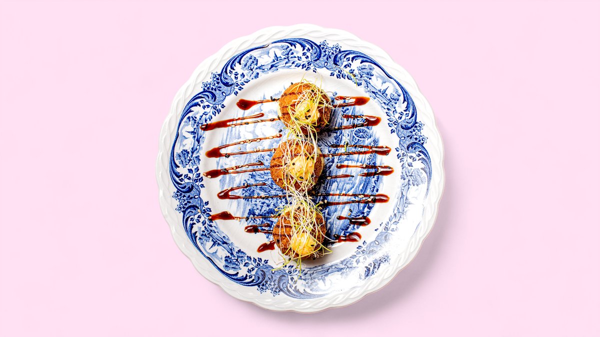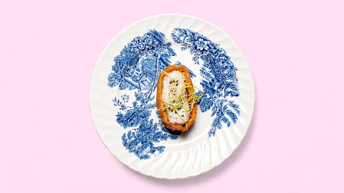 Friteret inari, agurk æble og goma toppet med avocado, goma, kataifi og sesam.