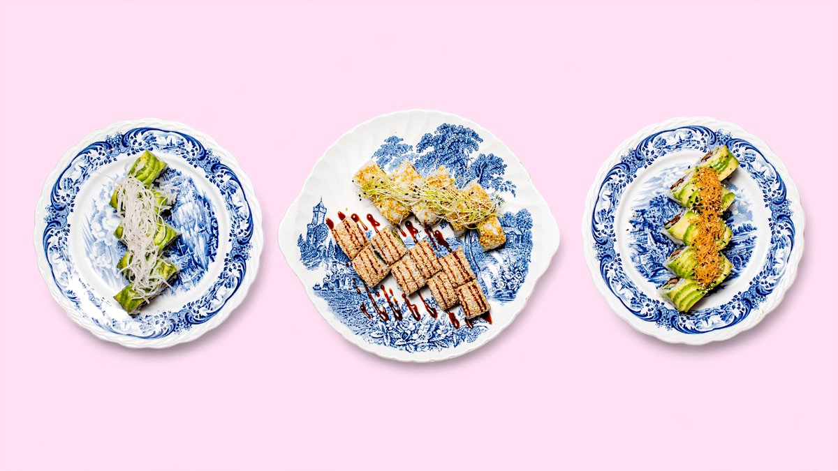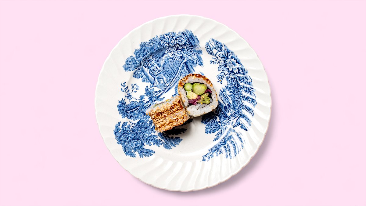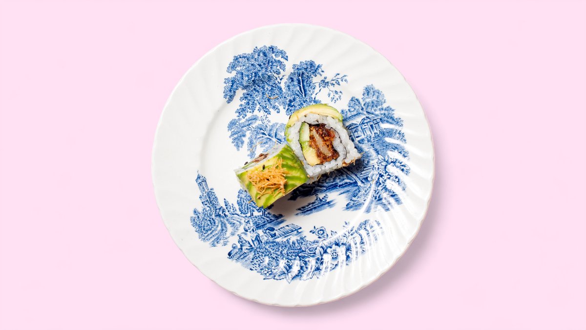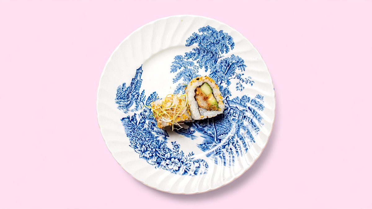 Tempurareje, asparges og chilimayo toppet med flamberet avocado, teriyaki, chilimayo, forårsløg og chilisesam.