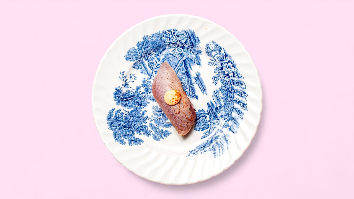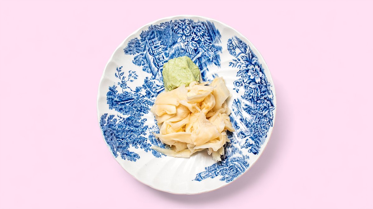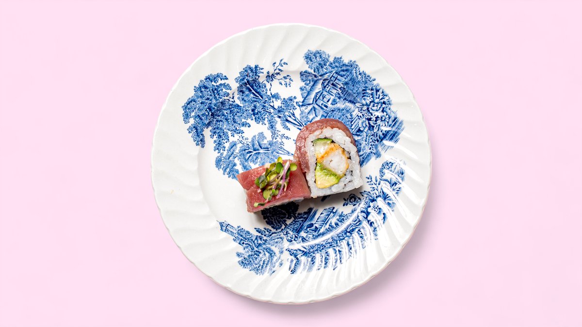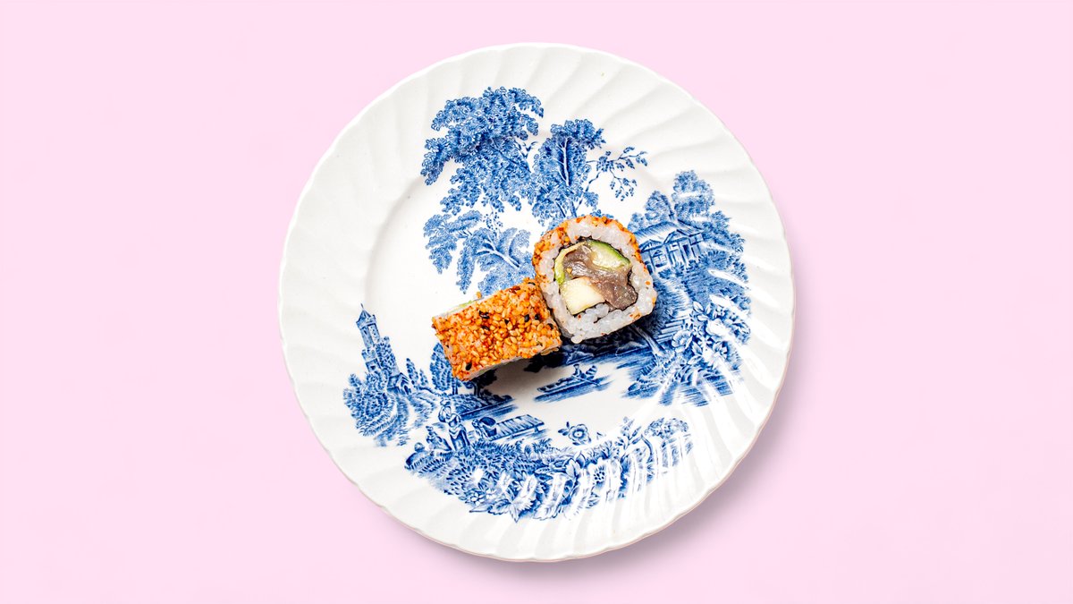 Tempurareje, asparges og chilimayo toppet med flamberet avocado, teriyaki, chilimayo, forårsløg og chilisesam.