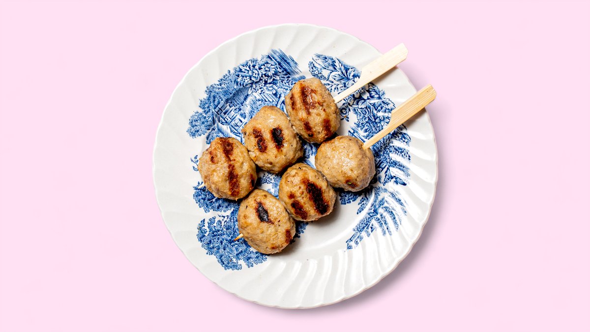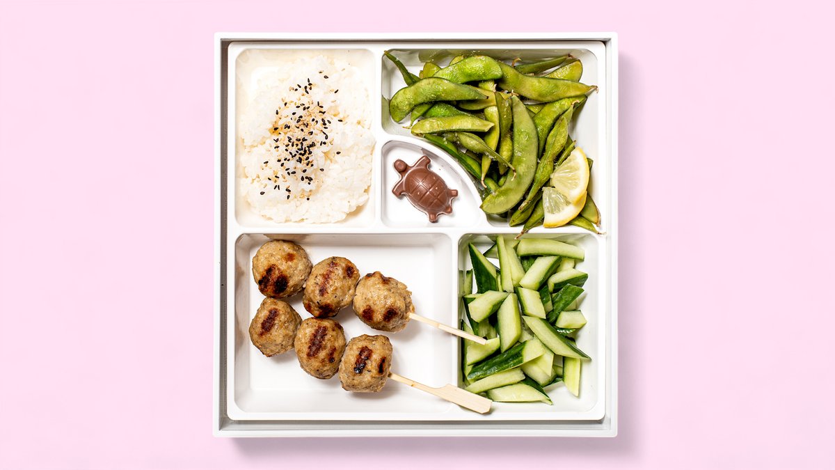 2 kyllingekødboller serveret med ris, agurk og edamame-bønner.