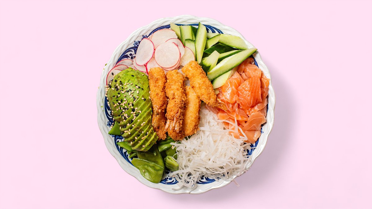 Laks, tempura-rejer, avocado, agurk, sukkerærter, daikon, radiser og rødløg serveret på bund af ris.