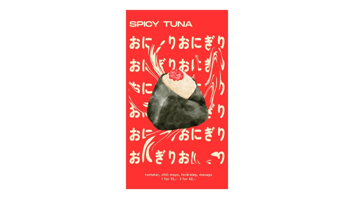 Tempura-reje, chilimayo, agurk, avocado toppet med tun, mangomayo og røde spirer.