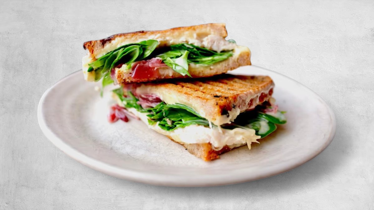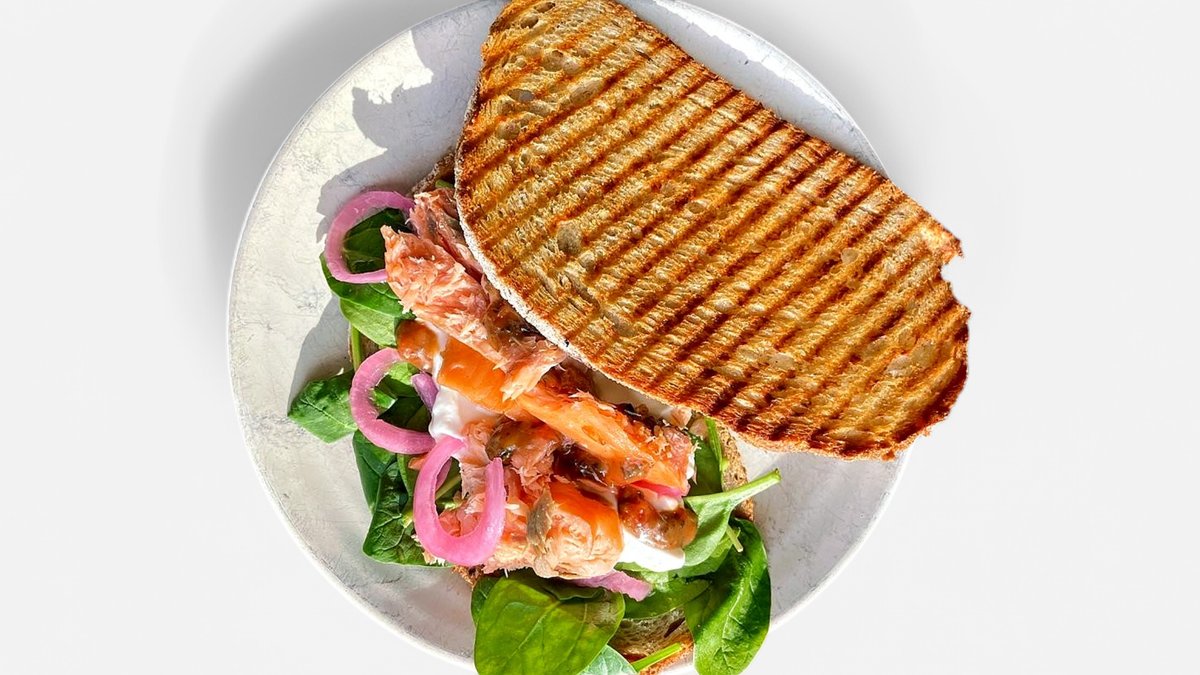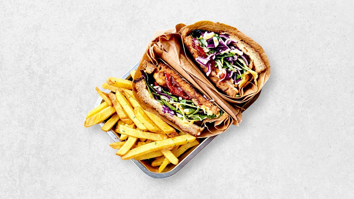 Toast + Drink. Surdejsbrød med pulled chicken, oregano, smeltet feta, frisk spinat, frisk tomat, syltet rødløg & tzatziki