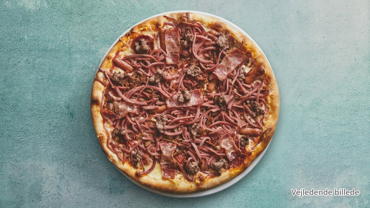 Tomatsauce, ost, oksekød, cocktailpølser, kebab, bacon, champignon og løg.
