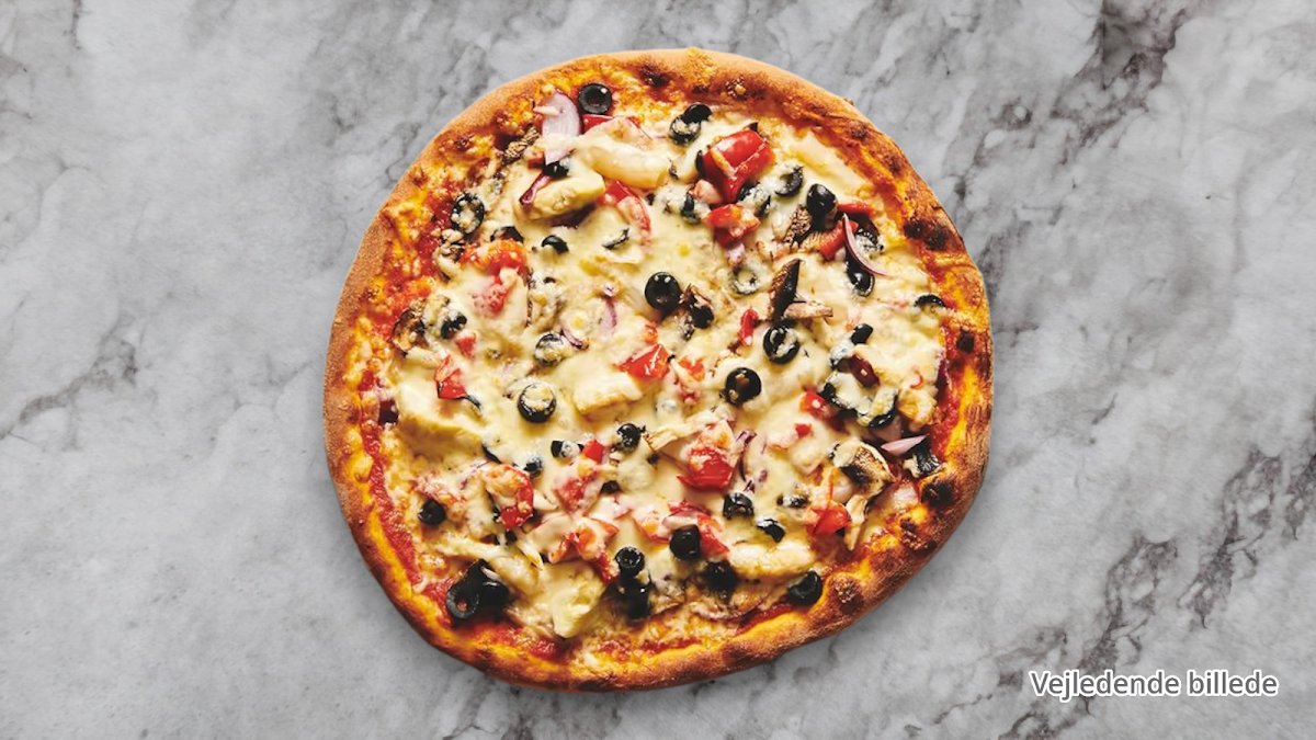 Tomatsauce, ost og vælg op til 5 slags tilbehør.
