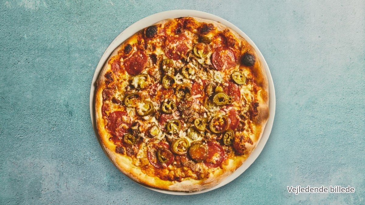 Tomatsauce, ost, pepperoni, kebab, løg, jalapeños og salsasauce.