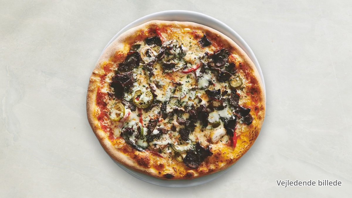 Tomatsauce, ost, skinke, oksekød, champignon, løg og jalapeños.