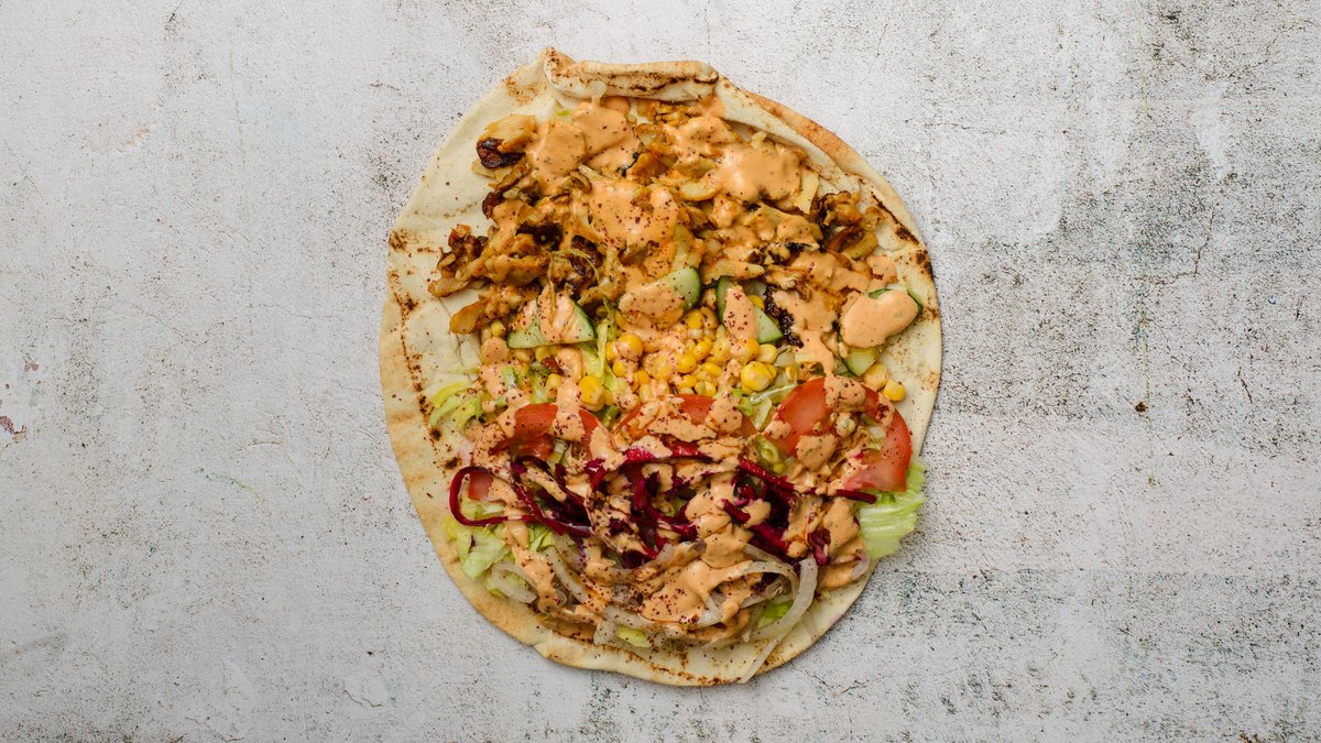Velsmagende kyllingewrap pakket med frisk salat, saftige tomater, , skarpe rødløg, toppet med en cremet dressing og serveret i varmt fladbrød.