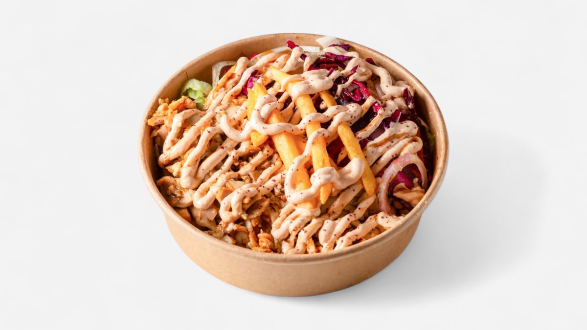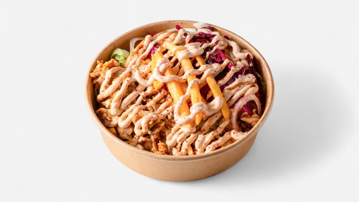 Kylling, pommes frites, salat, tomat, rødløg og dressing.